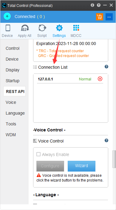 b. Service address (format: http://IP:port), where IP is the IP address of the computer where Total Control is installed, and the port can be found in the Total Control system settings.