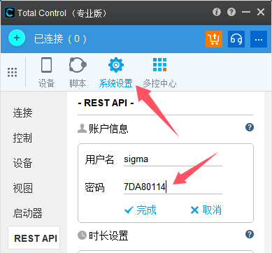 - 打开 主面板 → 系统设置 找到 REST 用户名和密码(示例中 sigma:7DA80114 需替换为您的实际信息)