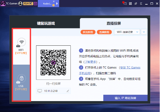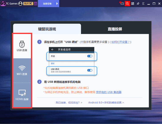 TC Games 可以通过 USB、WiFi、HDMI 三种方式连接安卓手机。